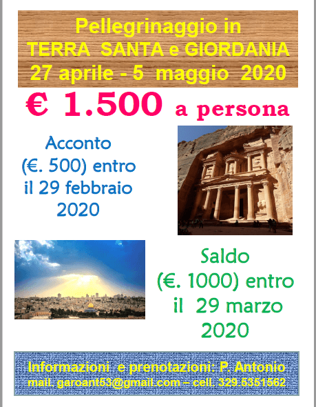 Padre Antonio in collaborazione con l'agenzia "EMMAUS VIAGGI" organizza il pellegrinaggio in TERRA SANTA E GIORDANIA dal 27 aprile al 5 maggio 2020. Cliccare per il programma 2020.pdf